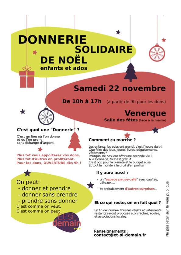 L’association Et si demain organise sa 5ème Donnerie « enfants et ados » le samedi 22 novembre de 10h à 17h à la salle des fêtes de Venerque (en face de la mairie).